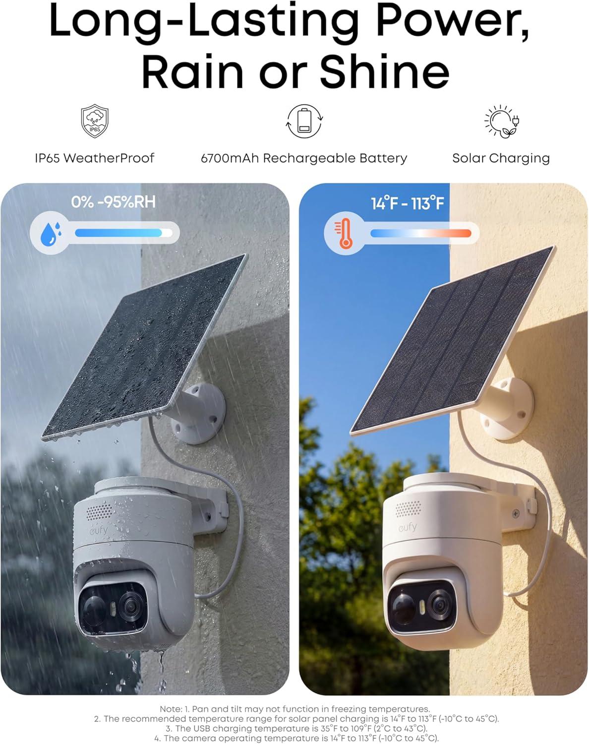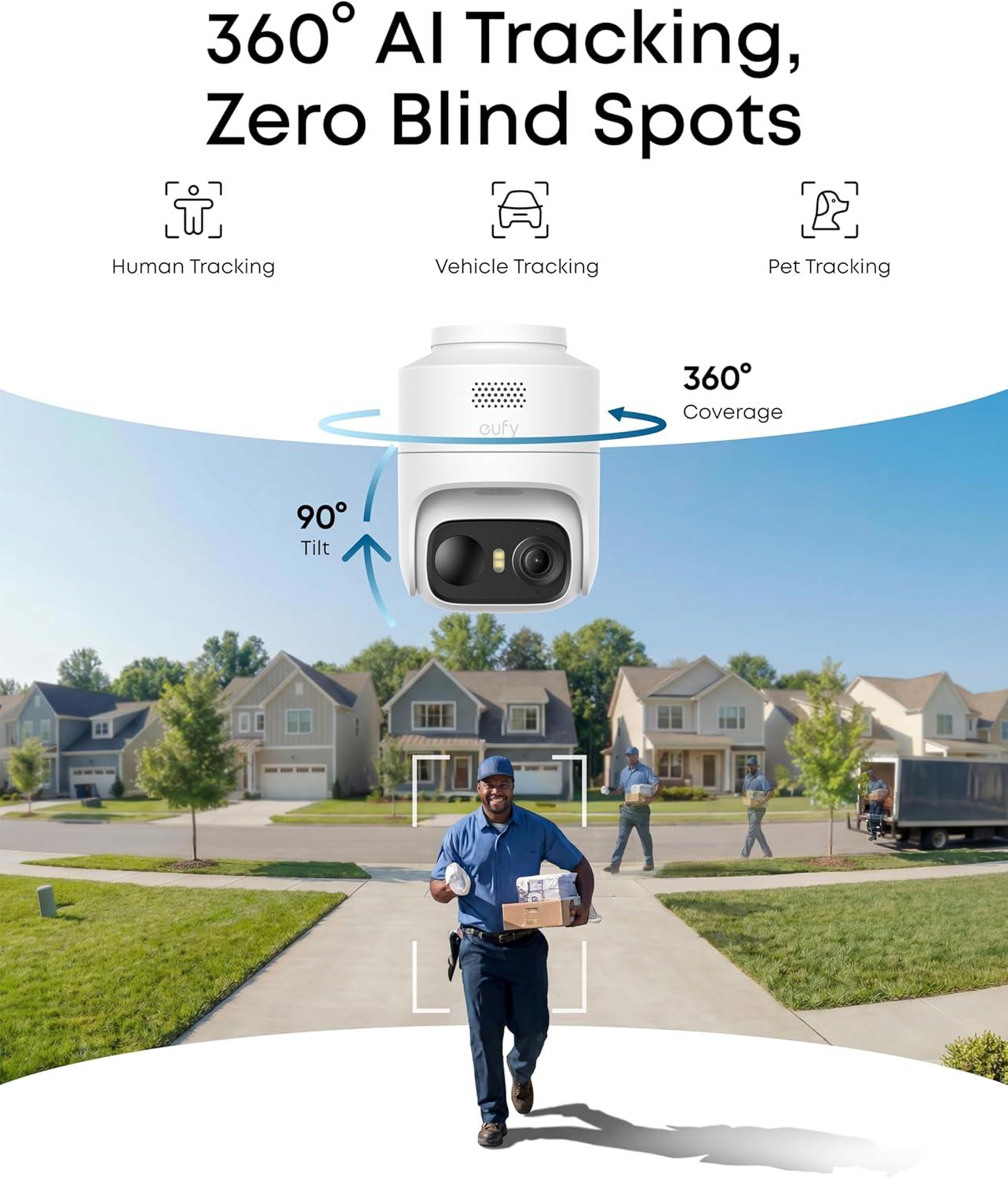 【𝟑𝟔𝟎° 𝐀𝐈 𝐓𝐫𝐚𝐜𝐤𝐢𝐧𝐠 𝐰𝐢𝐭𝐡 𝐏𝐚𝐧 𝐚𝐧𝐝 𝐓𝐢𝐥𝐭】Deliver 360° property coverage and eliminate blind spots with a single camera. Auto-tracking keeps subjects perfectly centered, providing ultimate home protection. NOTE: For smooth operation of your eufyCam C37, please update your eufy App to version 6.0.10 or newer.